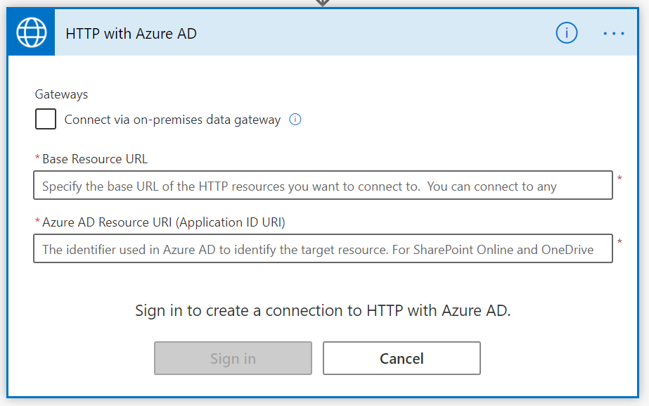 Last step is now to create an actual Task in To Do. I use the HTTP with Azure AD action, because it alleviates the hassle of fetching an access token to call Microsoft Graph API's. When using this for the first time, it asks for a Base Resource Url and Azure AD Resource URI (Application ID URI). Just enter https://graph.microsoft.com in both boxes: