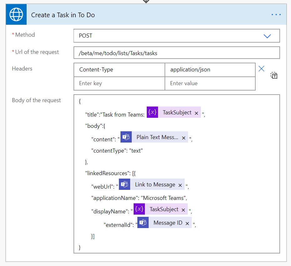 I'll be using just the Create task action from the Microsoft Graph API's, which in essence expects a POST call to a specific endpoint: