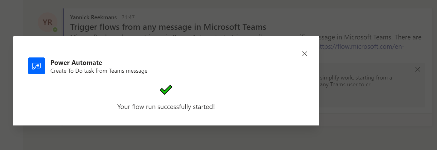 As shown above, the flow will show up on each message underneath the three dots and then the "more" menu item. Clicking on it will spawn a popup box, which would host the Adaptive Card if we had chosen to use it. In our case it just directly shows that it triggered the Power Automate flow successfully: