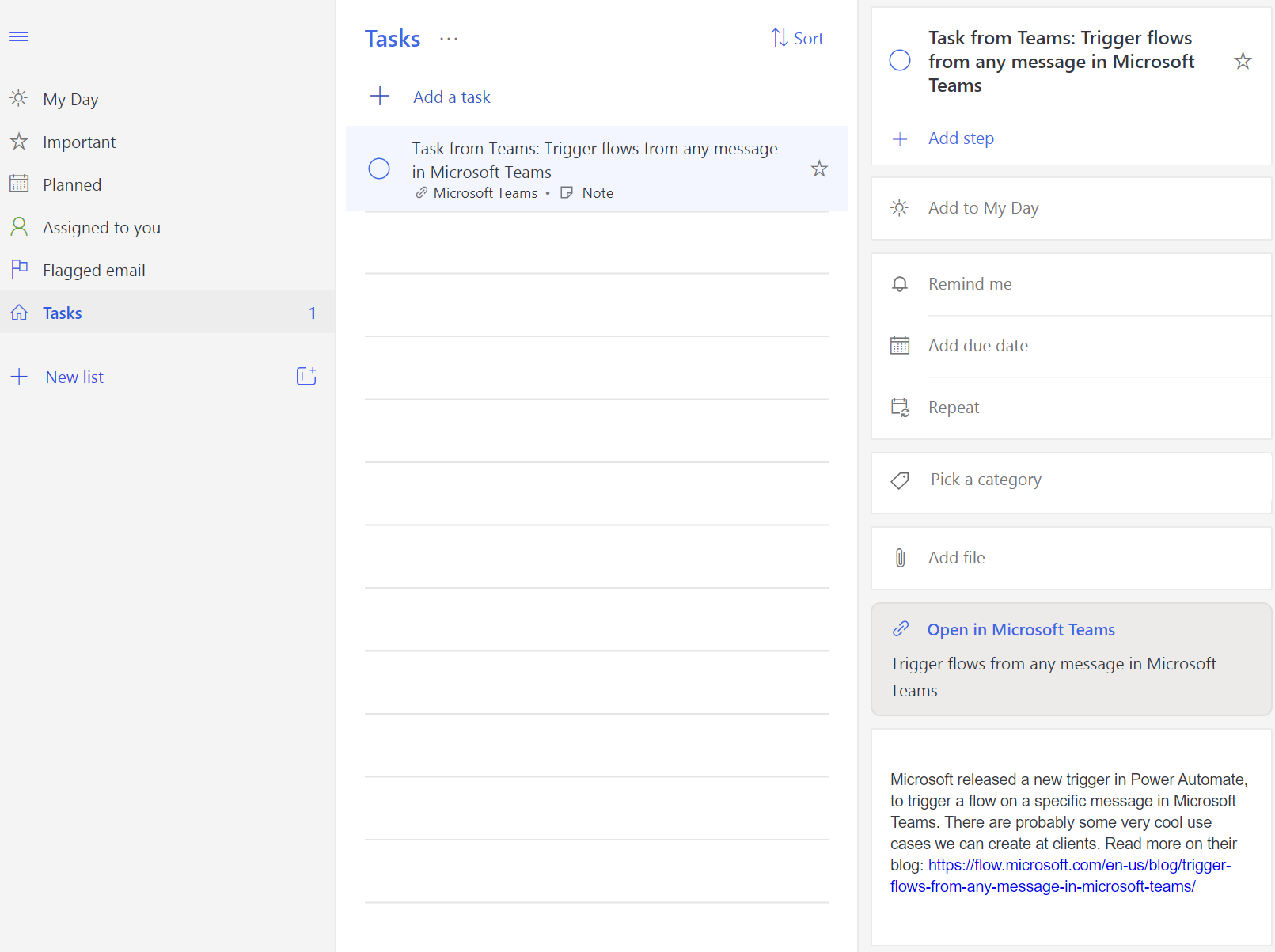If the flow runs correctly, I see my newly created task in the Tasks list in To Do. Now I can follow up on these messages in Teams by using To Do, where all other stuff I need to follow up on is located. In To Do, it'll look like this: