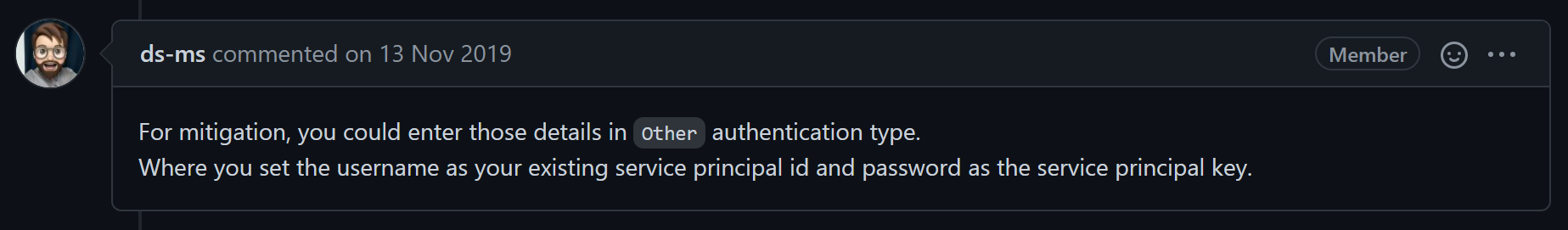 Ignore this one, which claims to work but still creates a new Service Principal anyways. It might have worked some day but at this point doesn't work at all.