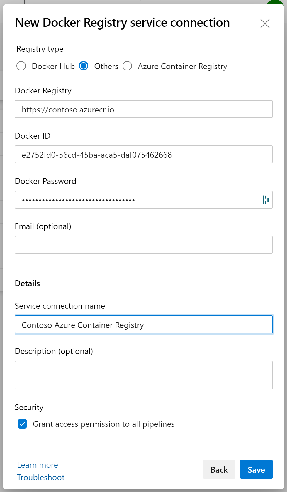 - Docker Registry: the URL to your Azure Container Registry, eg. https://contose.azurecr.io