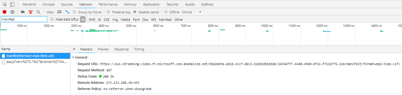 Michel's script downloads both youtube-dl.exe and ffmpeg.exe, so I just had to try it out with an Azure Media Services link. I find these links through the Networks tab in the Chrome Dev Tools, and I filter on manifest and then I press play.