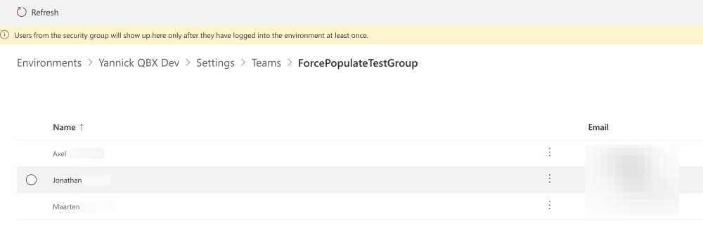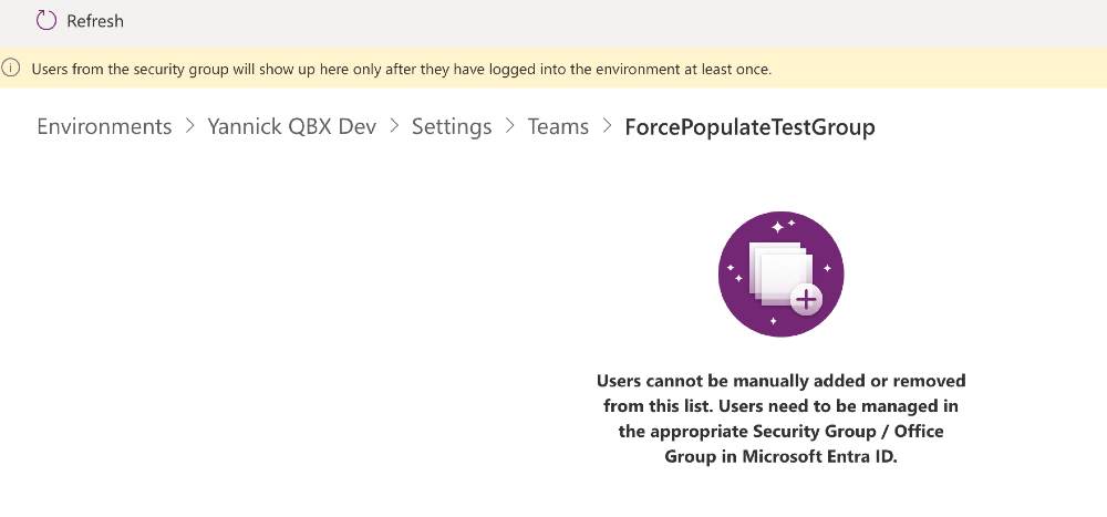 The downside of these Teams is the Just-In-Time population: users will only show up inside such a Team in Power Platform when they login to the environment... This provides challenges when you need them in the Team to have Security Roles applied for additional management purposes (like assigning them as an owner on records). Luckily, you can force the population by impersonating every user in a Dataverse REST API call!