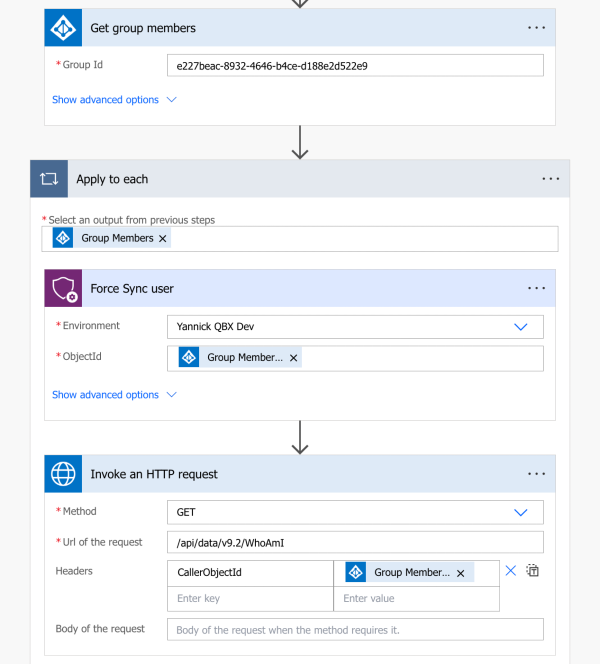 - Create a flow that loops the members of the Microsoft Entra ID Security Group, uses Force Sync to get them in the systemusers table, and impersonation on the WhoAmI call to force them inside the Team in Power Platform (make sure to check out the previous blog posts on this topic).