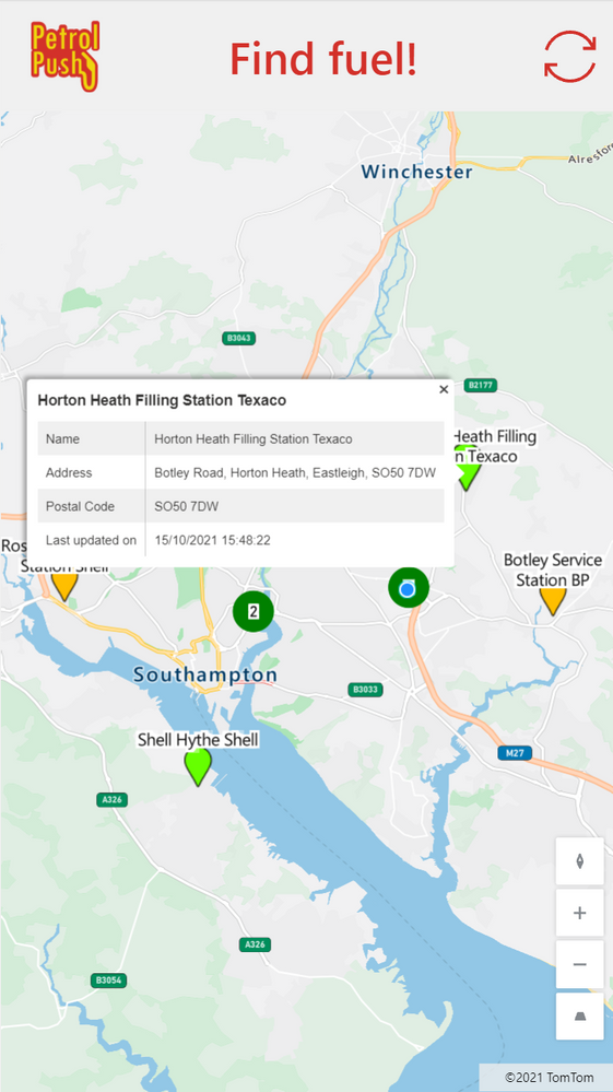 The resulting app shows a map with all identified gas stations and their last known status, indicated with the color of the pin. Selecting a specific gas station provides the user with more information on that station.