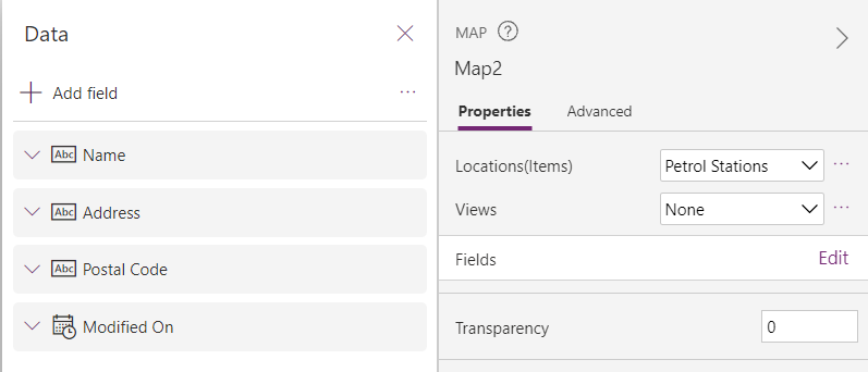 To get the location pins on the map, we added the Dataverse table as a source in the Items property of the map control. We are currently not doing any filtering, but this could be added if needed. The latitude, longitude, labels and colors is each contained in a specific column within the data source. These are provided as values for the following properties (where the text between quotes is the name of the column in the Dataverse table):