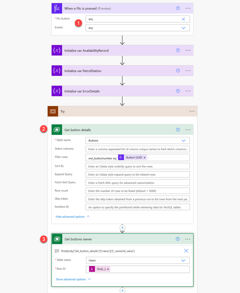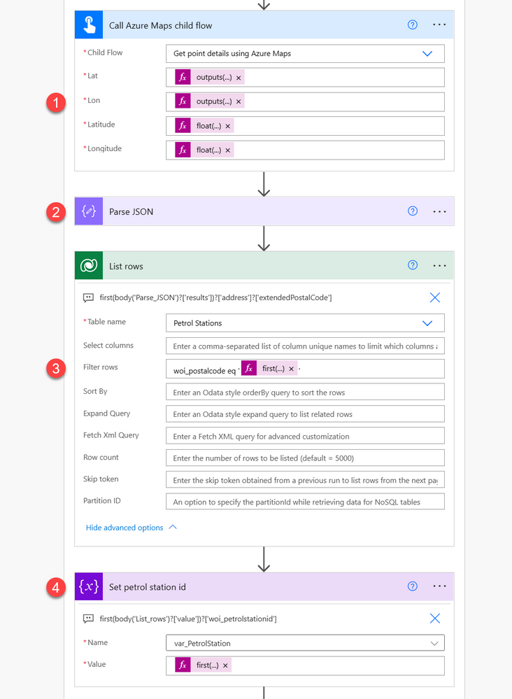 In a big picture, the flow was built to get information about location of a driver who triggered it, next to lookup details of the closest petrol station (by using Azure Maps API). Finally to save the station's data together with status into database, so later it can be displayed with a proper color of a pin, inside the app. But in details, it's much more interesting.