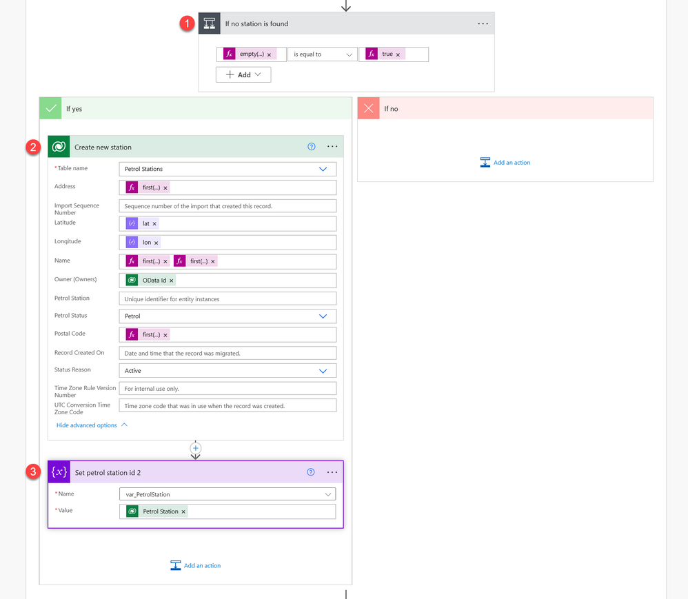 Process now checks, if station's row ID is empty (1) - if yes, it means it has to be created. Creation (2) of the record takes all the details returned from Azure Maps API, like full address, station name, lat and lon, information about driver who reported it and finally - the postal code. After that row ID of the created station is being saved into variable.