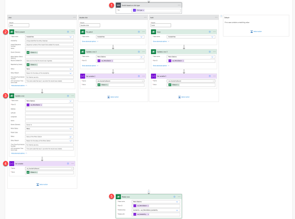 To check what action occurred, we are using switch action (1). For each branch process executes the same actions, just with different statuses. First, bot creates an entry in Activities table (2), to record latest status (to one from Petrol, No petrol, Issue) for the station together with driver details who reported it.