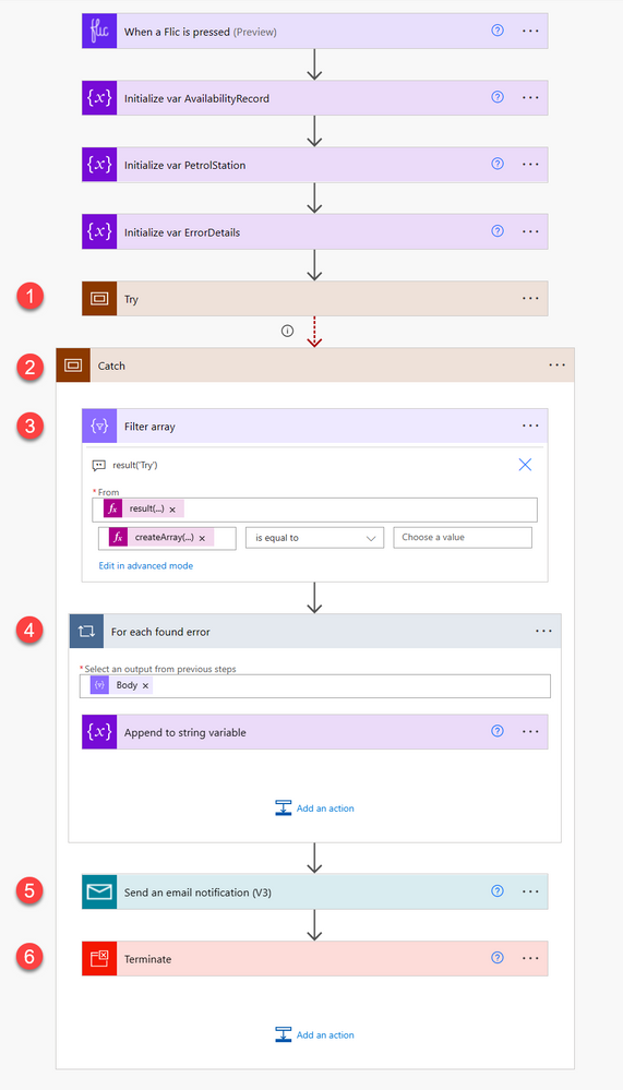 Process in the "Catch" scope first filters (3) results of the "Try" scope, using the expression result('Try') to leave only those entries which contain information about errors: @equals(createArray('Failed', 'TimedOut'), ''). Next for each such record (4) it is adding information about the details to a string variable. Finally, variable's contents is sent to admin as a notification (5) and the whole process ends up with "Failed" outcome.