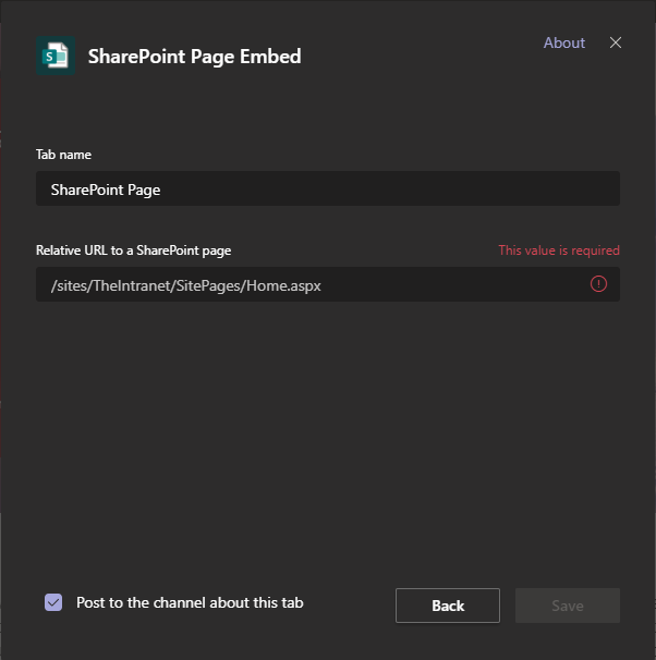 This gave me the idea to create a SharePoint Page Embed app for Microsoft Teams! The app provides a configuration page for your tab to enter the relative path to the SharePoint page that needs to be shown: